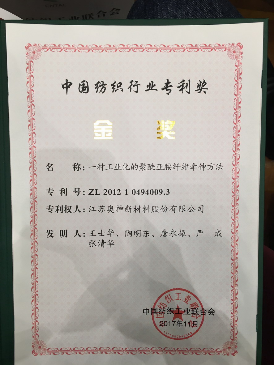 會上發布了首屆中國紡織行業專利獎、全國紡織科技創新人才等評審結果,集團公司副總經理王士華獲得“全國紡織科技創新領軍人才”榮譽稱號,并作為獲獎代表上臺發言。江蘇奧神新材料股份有限公司發明專利“一種工業化的聚酰亞胺纖維牽伸方法”獲得首屆中國紡織行業專利獎金獎。