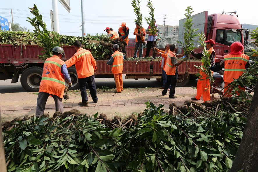 新光路鐵路橋至港城大道段南側綠化帶,因為人為踩踏、車輛碾壓導致綠化斑禿損壞嚴重,為盡快恢復綠化原貌,改善市容市貌。8月18日,裕升、裕欣養護公司組織80多名綠化工,從早上6點一直干到下午6點,卸苗、運苗、挖坑、插苗,烈日酷暑下奮戰一整天,中午在樹陰下吃點盒飯,喝點礦泉水,繼續工作,橘黃色工作被汗水浸透、被烈日烤干,這樣有好幾個來回。“今天我們要在這片綠化補植紅葉石楠、金森女貞等模紋小苗1萬余株,紅葉石楠球等灌木110株,有效改善該路段綠化植被,提升城市形象,我們還要在黃海續道補植草坪近30000平方,在這條1000多米長的路段,有車輛維修點50多家,車輛出入,對路邊綠化帶傷害非常大,這一路段也是環衛整治長期存在的‘老大難’,這次,在開發區行政執法部門的配合下,我們要重新種植草坪,對這一‘老大難’路段植被進行恢復,另外德蘭南路、東路補植苗木近80萬元的綠化工程也已開工上土整土,接著要栽苗,根據開發區創衛部署要求,上述這些事情必須在8月底完成,所以說時間相當緊,職工們都冒著高溫,加班加點搶進度。”公司副總經理郁宏峰說。