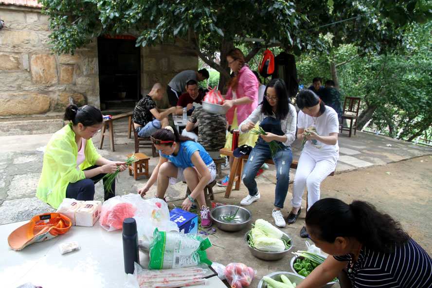 這處清幽潔凈的農(nóng)家小院成了隊(duì)員大展廚藝的用武之地,大家迅速整理好自帶的蔬菜食物,按各自特長分好工。有清理蔬菜的、有和面的、有刷鍋燒水的,那些實(shí)在幫不上忙的便湊到一起圍坐在院中的樹蔭下開始“摜蛋”比賽。廚房中,面對農(nóng)戶家中的那兩口大草鍋,負(fù)責(zé)炒菜的隊(duì)員直撓頭,因?yàn)樵诔抢飳?shí)在是無處尋覓這樣的鍋灶了,更不知該如何才能把這灶火燒得旺旺的。這時(shí)我們的女隊(duì)員劉惠自告奮勇,勇敢地?fù)?dān)起了“伙頭軍”的重任。還別說,在經(jīng)過戶主老大爺?shù)囊环更c(diǎn)后,一會兒功夫這灶火便被她燒得有規(guī)有距起來。很快,灶房便飄出了炒肉、煎蛋的香味。此時(shí),院中也已擺起了包旱餃的陣式來了。面已和好,兩種口味的餡料也已備好。有負(fù)責(zé)搟餃子皮的,有負(fù)責(zé)包餃子的,隊(duì)員們賽速度、賽質(zhì)量,兩種口味的餃子被分別擺放在各自的簸箕里。看著形態(tài)各異的餃子,大家忍不住評價(jià)起來,最終有隊(duì)員被冠上了“專業(yè)面點(diǎn)師”的雅號。人多力量大,當(dāng)所有的菜肴、面點(diǎn)擺到長桌上時(shí),大家開心不已,雖然這算不上美味佳肴,但自己的勞動果實(shí)卻總是最美味。