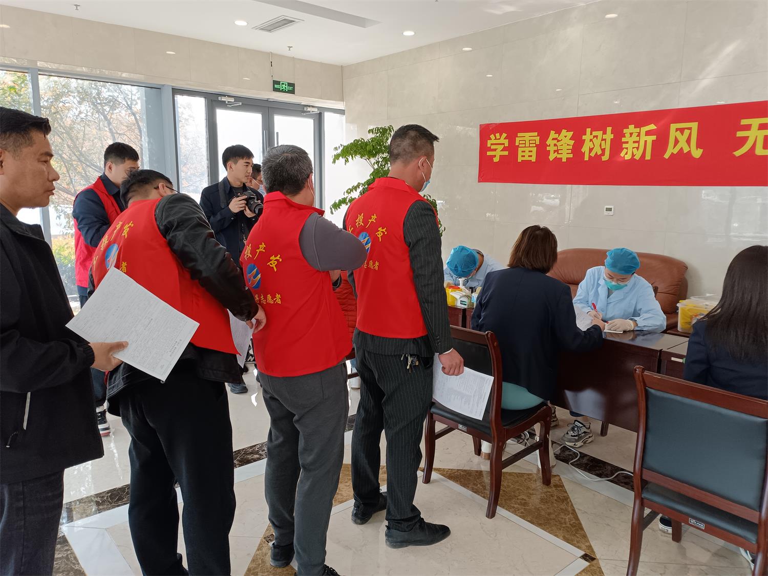 參加無償獻血的志愿者早早就來到了獻血地點,熱情洋溢而又井然有序地排隊,等候醫生給獻血者檢查血壓、脈搏和詢問相關信息。檢查通過后,獻血者依次進入獻血進行獻血。