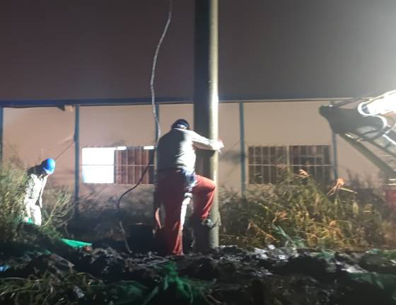 今年的10月天氣還是熱的厲害,電桿被太陽(yáng)曬的滾燙,搶修人員臉上掛滿(mǎn)了豆大的汗珠,工作服已經(jīng)全部濕透。為了搶時(shí)間,抓進(jìn)度,作業(yè)人員們?nèi)徊活櫍廊痪o張有序地工作著。現(xiàn)場(chǎng)搶修工作涉及吊車(chē)、挖掘機(jī)等大型施工機(jī)具,安全管控尤為重要,現(xiàn)場(chǎng)所有搶修人員在工作負(fù)責(zé)人的指揮下平穩(wěn)有序的推進(jìn)搶修工作,吊車(chē)擺放位置、挖掘機(jī)挖桿洞的位置等每一個(gè)關(guān)鍵工作點(diǎn)都在搶修人員的嚴(yán)格監(jiān)督下進(jìn)行,不敢有絲毫松懈。就在這時(shí),天公不作美,突然下起了大雨,可是大雨并沒(méi)有攔住搶修工作。臺(tái)北供電所現(xiàn)場(chǎng)所有的搶修人員在錢(qián)所長(zhǎng)的帶領(lǐng)下,穿著濕透的工作服在雨中指揮挖掘機(jī)開(kāi)挖桿洞、組立電桿、連接導(dǎo)線-------搶修人員在天昏地暗的雨中穿梭,雨水和汗水交匯在電力搶修人員的臉龐上,大家都來(lái)不急擦拭一下臉上的雨水,在雨中忙碌著。經(jīng)過(guò)4個(gè)半小時(shí)的緊張有序搶修,晚上19:30分10KV港北線恢復(fù)供電。