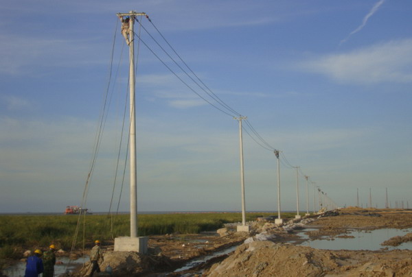 連云新城三期供電線路緊貼海堤邊。受海堤建設進度和海風海潮的影響,低矮的壩堤經(jīng)常被風刮起的海浪浸頂,石塊突起,洼水漣漪,淤泥纏足,堤邊路面凹凸不平,道路僅限一輛車通行,擁擠不堪,工程施工難度極大。為提升速度,加快進度,臺北供電所克服困難,緊鑼密鼓地展開工作,以期早日完工。現(xiàn)場勘察地形地貌,了解潮汐運動規(guī)律,制定施工計劃,設計措施方案,組織人力,采購材料,投入施工。施工人員采用彈性工作時間,利用落潮時機,搶運電桿,及時立桿和裝配。職工們發(fā)揚不怕苦,不畏難的精神,不懼海風吹臉、海水浸衣,爬上距離海平面二十多米仿佛搖擺不定的高桿,懸在空中一絲不茍地操作,保障了工程的全面竣工。