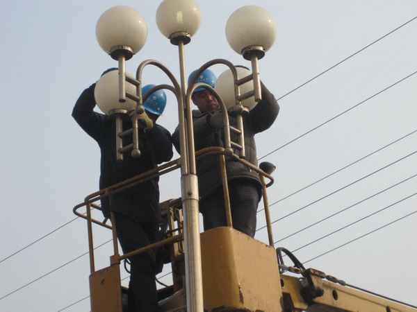 1月13日,青口供電所為了鹽場(chǎng)春節(jié)期間的美化、亮化,組織七名職工義務(wù)為鹽場(chǎng)搶修路燈。(宋中文)