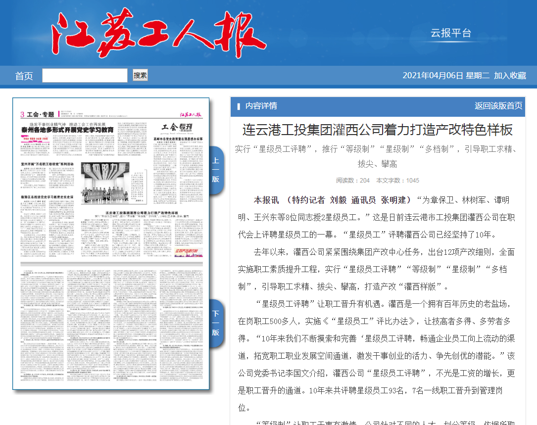 《江蘇工人報》刊登——連云港工投集團灌西公司著力打造產改特色樣板