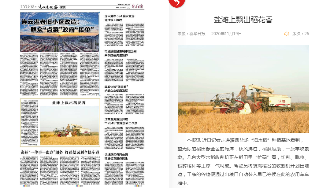 近日記者走進(jìn)灌西鹽場(chǎng)“海水稻”種植基地看到,一望無際的稻田像金色的海洋,秋風(fēng)拂過,稻浪滾滾,一派豐收景象。幾臺(tái)大型水稻收割機(jī)正在稻田里“忙碌”著,切割、脫粒、粉碎稻稈等工序一氣呵成。駕駛員將裝滿稻谷的收割機(jī)開到田埂邊,干凈的谷粒便通過出糧口自動(dòng)裝入早已等候在此的農(nóng)用車車廂中。