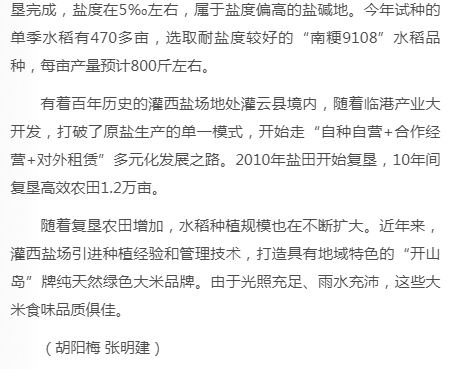 有著百年歷史的灌西鹽場(chǎng)地處灌云縣境內(nèi),隨著臨港產(chǎn)業(yè)大開發(fā),打破了原鹽生產(chǎn)的單一模式,開始走“自種自營(yíng)+合作經(jīng)營(yíng)+對(duì)外租賃”多元化發(fā)展之路。2010年鹽田開始復(fù)墾,10年間復(fù)墾高效農(nóng)田1.2萬畝。