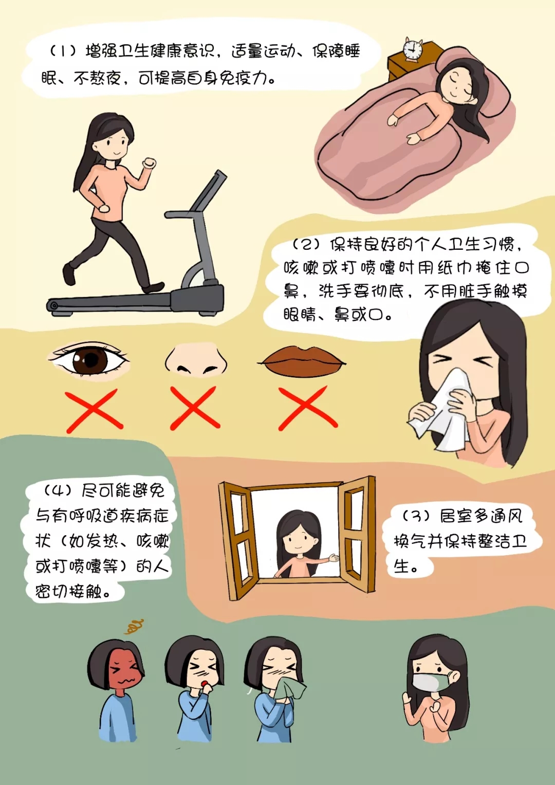(1)增強衛生健康意識,適量運動、保障睡眠、不熬夜,可提高自身免疫力。