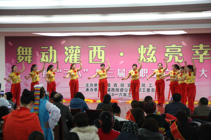 為了迎接第106個國際“三八”婦女節的到來,3月8日上午,灌西投資公司舉辦了“舞動灌西·炫亮幸福”第三屆女職工廣場舞大賽。這次比賽邀請了尚慶葉等七名集團公司各單位原女工主任擔任評委,做到了公平、公正,比賽成績充分顯示了各自的真實水平。來自全公司各單位共11支參賽隊伍給大家來了精彩的表演,觀看比賽的職工群眾200余人。