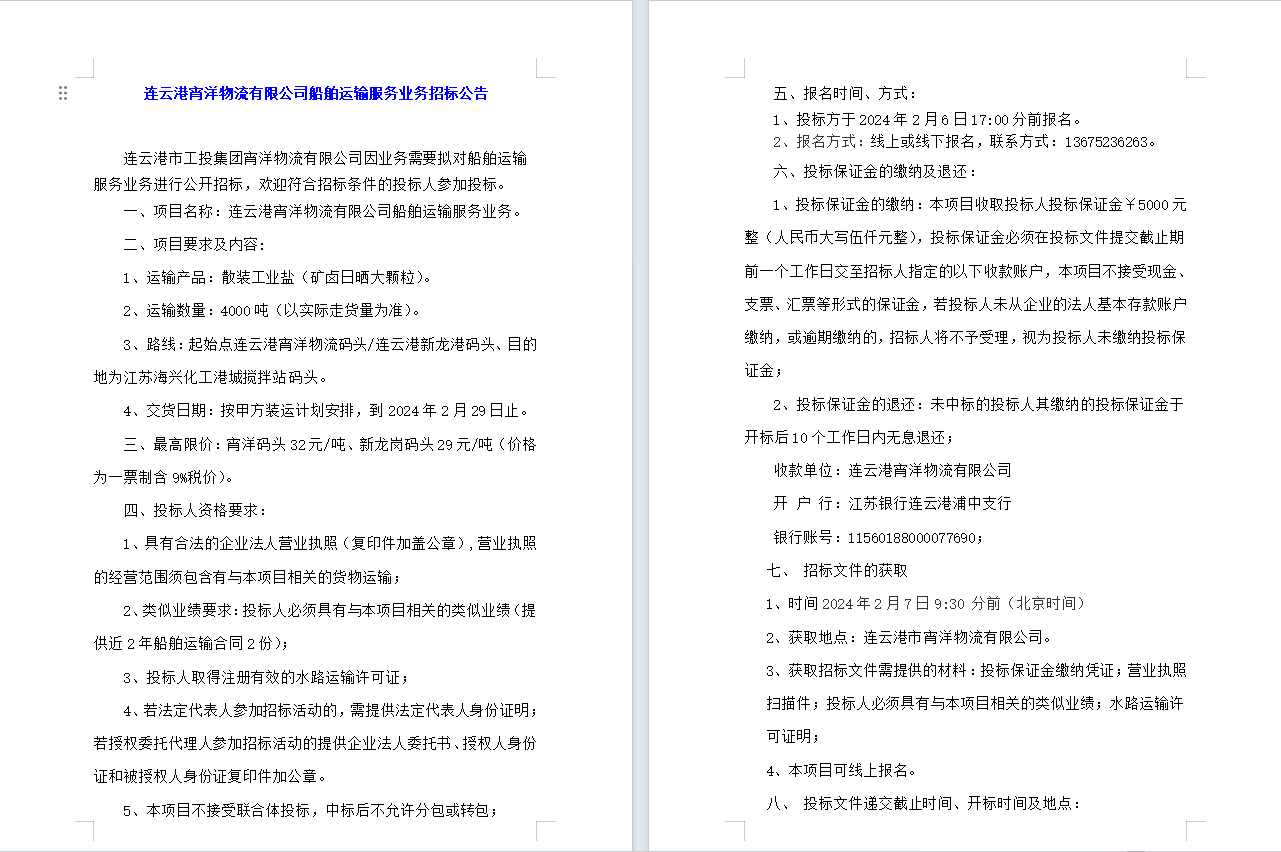 連云港宵洋物流有限公司船舶運輸服務業務招標公告