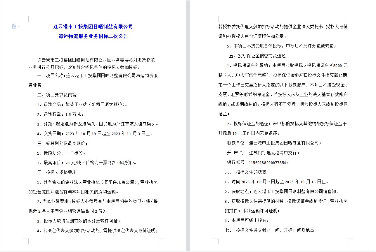 連云港市工投集團日曬制鹽有限公司 海運物流服務(wù)業(yè)務(wù)招標二次公告