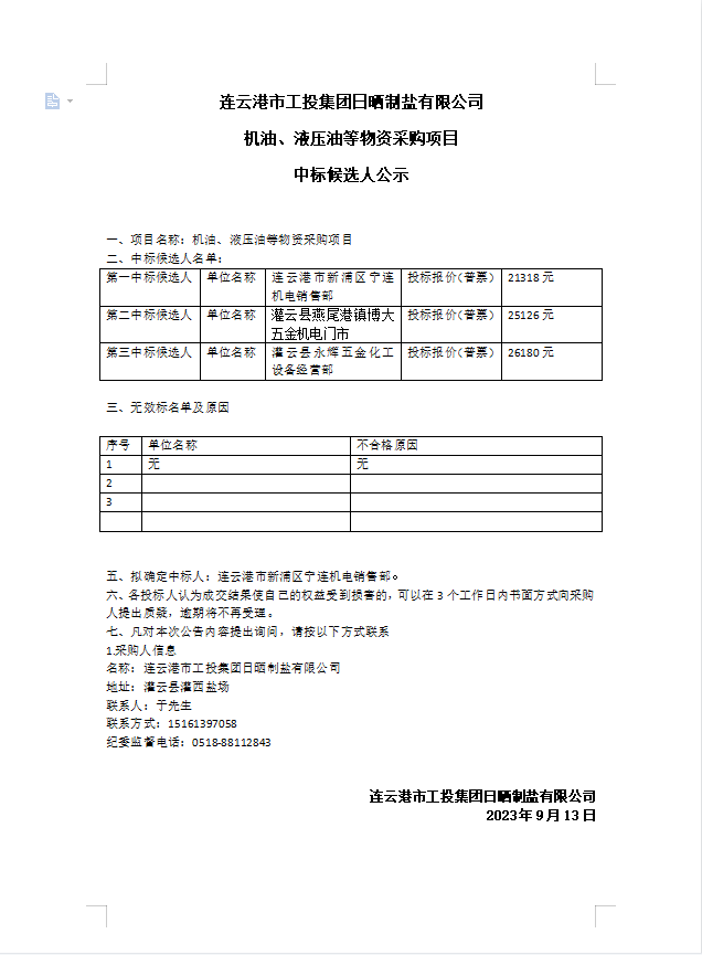 連云港市工投集團(tuán)日曬制鹽有限公司 機油、液壓油等物資采購項目中標(biāo)候選人公示