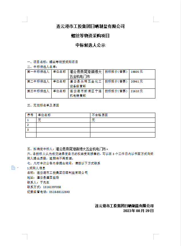 連云港市工投集團(tuán)日曬制鹽有限公司螺絲等物資采購項(xiàng)目中標(biāo)候選人公示