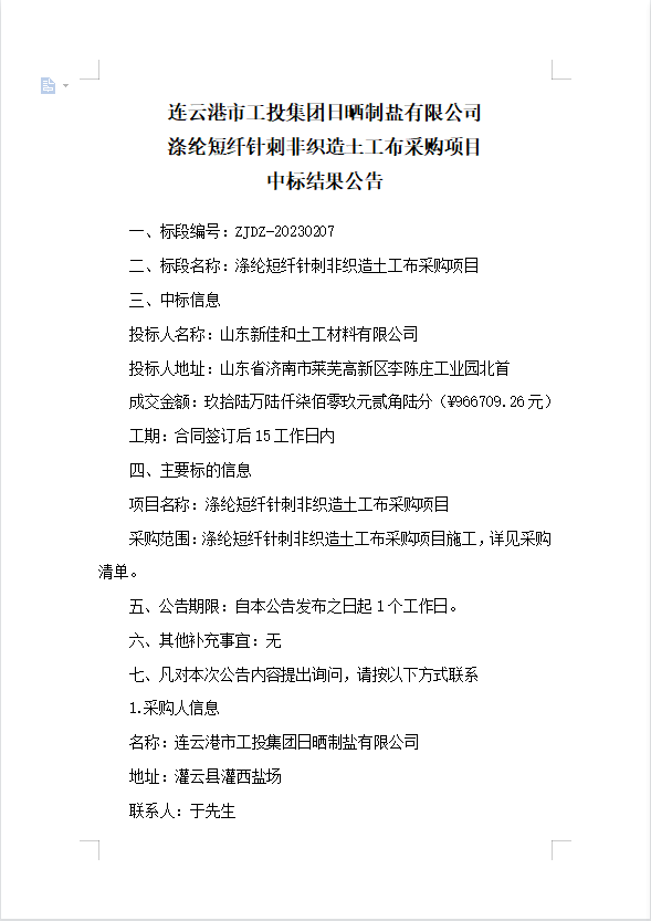 連云港市工投集團日曬制鹽有限公司滌綸短纖針刺非織造土工布采購項目中標結(jié)果公告