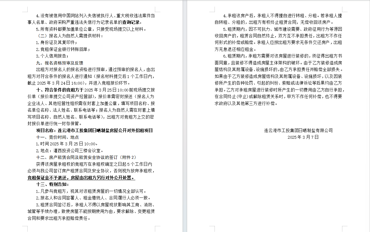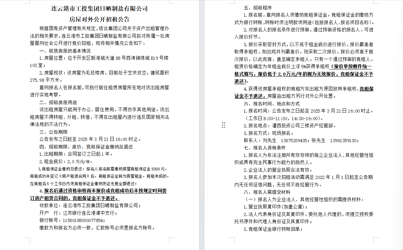 連云港市工投集團日曬制鹽有限公司房屋對外公開招租公告