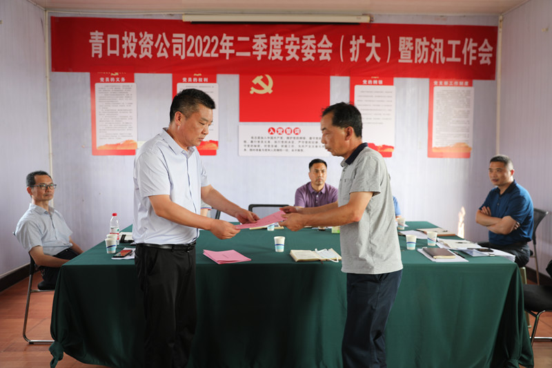 演練結束后,工作會在承擔主要防汛任務的三洋分場召開。會上,生產安全部匯報二季度安全工作情況,副總經(jīng)理許太冬傳達《關于深刻汲取近期事故教訓采取嚴厲措施堅決遏制事故多發(fā)勢頭的通知》,副總經(jīng)理楊守明布置公司安全工作及防汛工作,各單位遞交2022年度防汛工作責任書。
