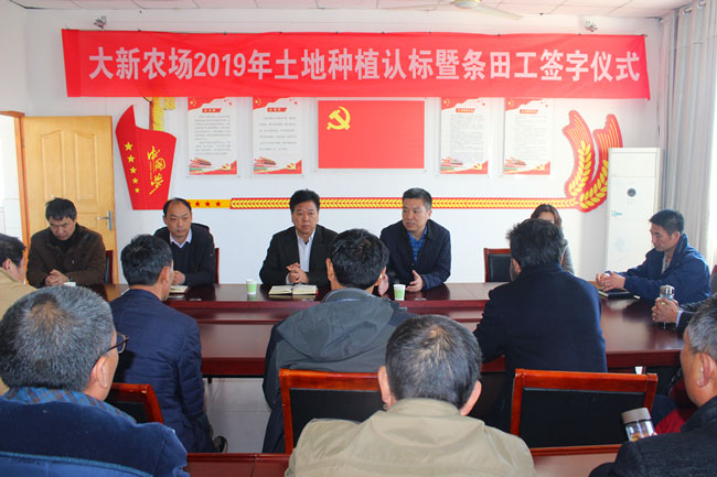 為序時推進農業(yè)生產(chǎn),確保各項生產(chǎn)工作快速啟動, 3月22日上午, 公司舉行大新農場 2019年土地種植認標暨條田工簽字儀式,公司總經(jīng)理史祥平、副總經(jīng)理周緒祥出席。
