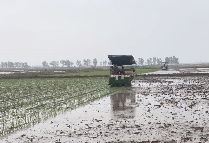 6月4日,大新農場搶抓農時,全面開始水稻插秧工作,插秧機來回穿梭作業,田間地頭一派忙碌景象。當天,組織插秧機13臺,秧苗轉運車6臺次,一天可以完成插秧作業550余畝。(王 璐)