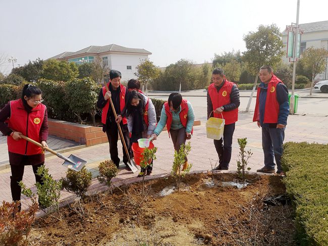 會后,服務中心與社區一行人身穿紅馬甲迅速投入到緊張的植樹活動中,大家三五人一組,分工協作、配合默契,扶起樹苗、揮鍬鏟土、培實新土,齊心協力種下一株株樹苗,呈現出一派火熱的勞動場景。