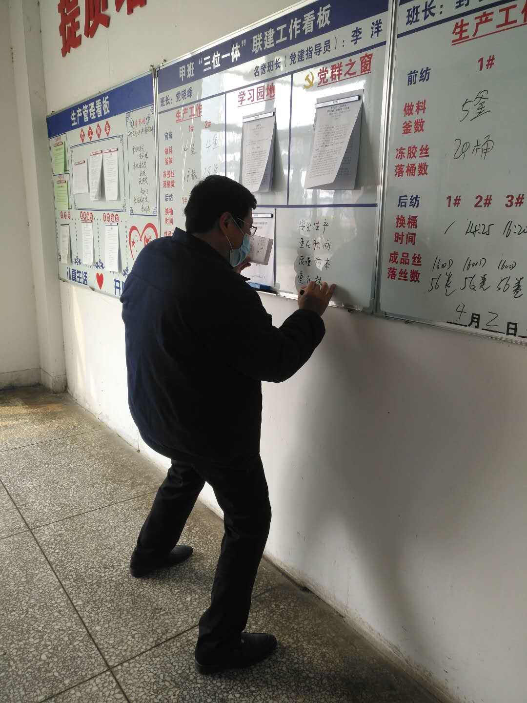 圖為生產設備部副部長王勇為甲班書寫班組口號。