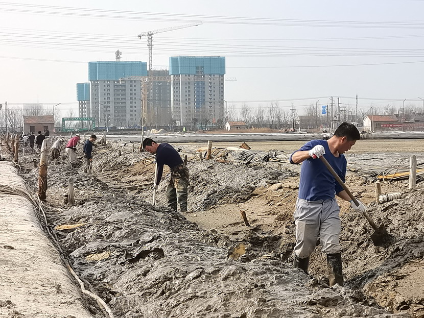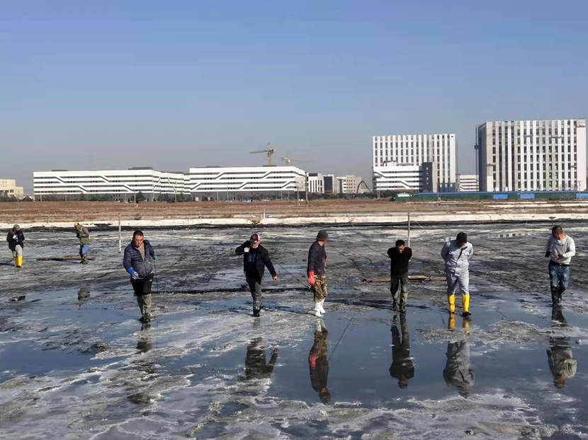 礦鹽復產項目部,聘請日曬制鹽專家王緒前進行工藝指導,聘請勞模朱春年帶領團隊攻堅。復產戰役從202112月就打響了,春節的時候,他們僅休了三天假,大年初三全部到崗,一鍬一鍬挖泥通溝,一條一條池堰加高整平,一塊一塊鹽田清理壓實......2月,他們硬是把征地后廢棄許久的鹽田和邊角地整理成礦鹽基地,結晶池面積達1950公畝,達產可產原鹽20000噸。