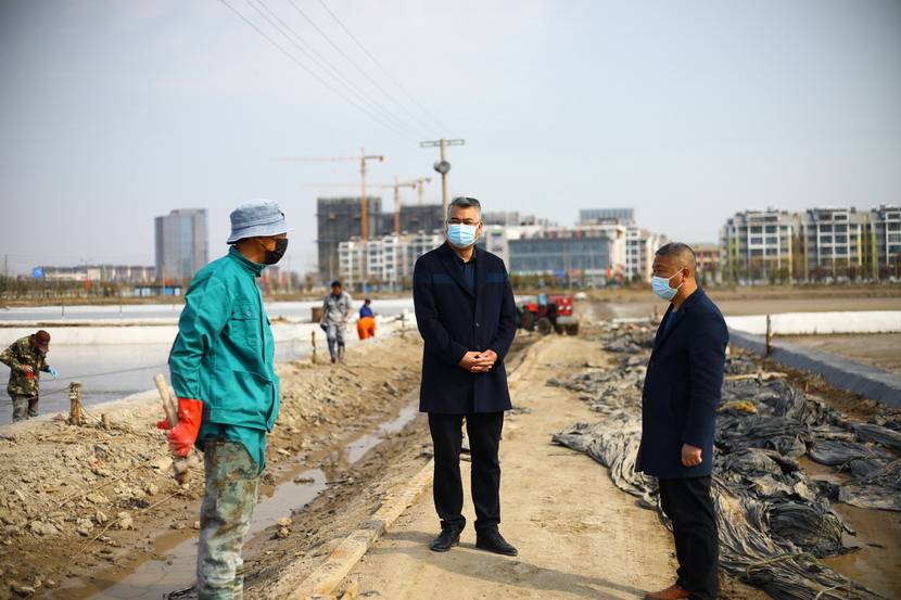 第一站來到海州灣公司昌圩班組。該班組4月1日礦鹵灌池,目前第四塊結晶池正在進鹵,該公司三大組長帶著各自隊伍都來支援,一起給新灌結晶池更換新塑苫布,大家忙的不亦樂乎。王董事長首先慰問大家,新冠疫情暴發以來,海州灣公司廣大員工克服困難,一邊強化疫情防控,一邊加班加點抓生產,雖然有的工作耽誤了,但是礦鹵灌池工作仍然趕在天時轉好之前進行了。昨天進鹵的結晶池底已經鋪上了一層鹽,看起來甚是喜人。昌圩班組負責人,老先進老黨員朱春年同志看到王董事長來檢查工作,他也非常高興,和海州灣公司負責人劉天義一同聚攏過來,與董事長攀談,匯報工作。最后王董事長強調,一定要抓緊灌池,抓緊更換新塑苫布,打好“礦鹵復產”戰,我們基礎產業牢固了,臺北的發展也就穩固了。同時,也不要忘記抓好疫情防控工作,職工集體工作時要保持一米線距離,保證不扎堆。劉天義、朱春年代表職工表態,一定按照投資公司有關布置抓好各方面工作,一定拼命干,加油干,爭當虎將打頭陣,當好“臺北保衛戰”主攻隊。