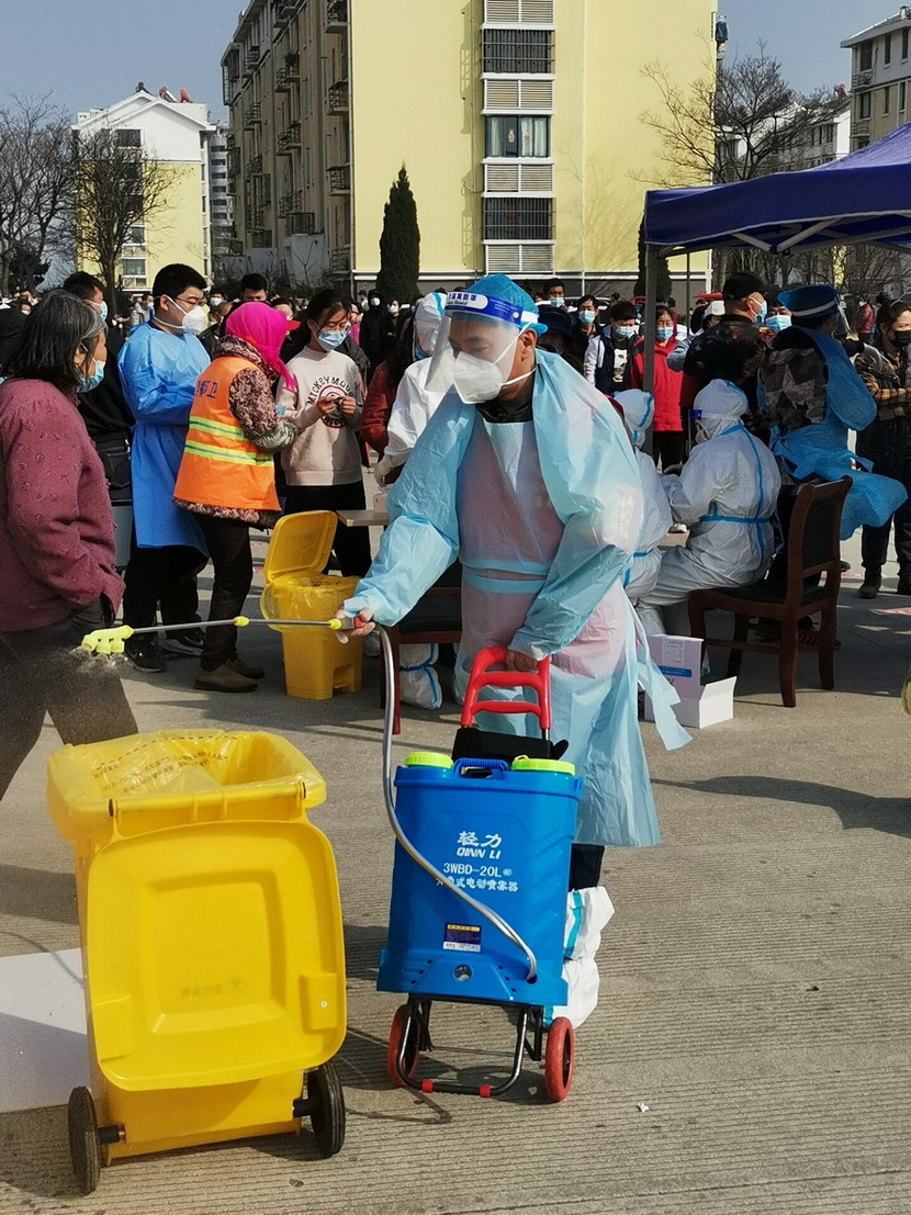 ▲海州區幸福路街道“最美大白”秦英(公司內退黨員)在工作中