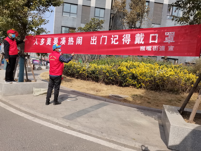 ▲昌圩社區臨時黨支部書記李明,黨員骨干于洪亮懸掛疫情宣傳標語。