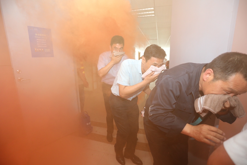 在消防演練現場我們模擬了突發火災,受濃煙影響的參培人員進行快速有序的疏散逃生。按照董教員的講解要求,大家“三折八疊”毛巾,浸濕后捂住口鼻,俯下身子,肘部依靠著墻壁,一個跟著一個,在濃煙中疏散撤離。接著演練還進行了油盆滅火和高壓水槍使用培訓實操。參演人員嚴肅認真,服從指揮,整個應急疏散演練過程忙而不亂、井然有序。