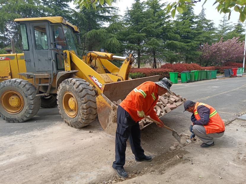 項目開工前,盛達市政分公司召開中科院提升改造專項會議,根據(jù)各單項工程落實安全生產(chǎn)責任制,分班組劃片區(qū),并對隱蔽工程、交叉作業(yè)項目制定專項施工方案。該項目工期僅 30 天,由于工期緊,任務重,施工人員正在開足馬力搶時間、趕進度,在項目施工現(xiàn)場,原道磚清除、舊電纜拆除、新建道路基礎墊層、路牙石鋪設等各施工任務同步開展,挖掘機、裝載機、貨車等各種工程車輛有序穿梭,各施工現(xiàn)場圍擋、指示牌、路錐等擺放規(guī)范,人員工作服、安全帽等穿戴整齊,確保安全文明施工。