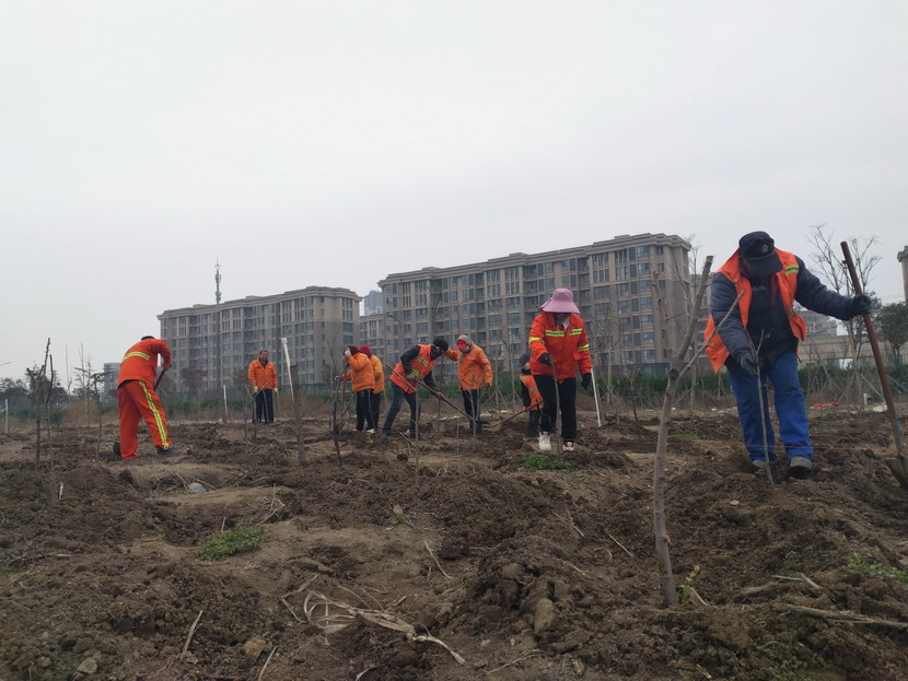 326日下午,陽光明媚,春風和煦,益豐園林分公司的苗圃養護班組正在進行一場緊鑼密鼓的作業。師傅們熟練地揮舞著鋤頭,計劃挖掘500余顆果樹苗栽種在80畝苗圃基地,開始一段新的生命旅程。