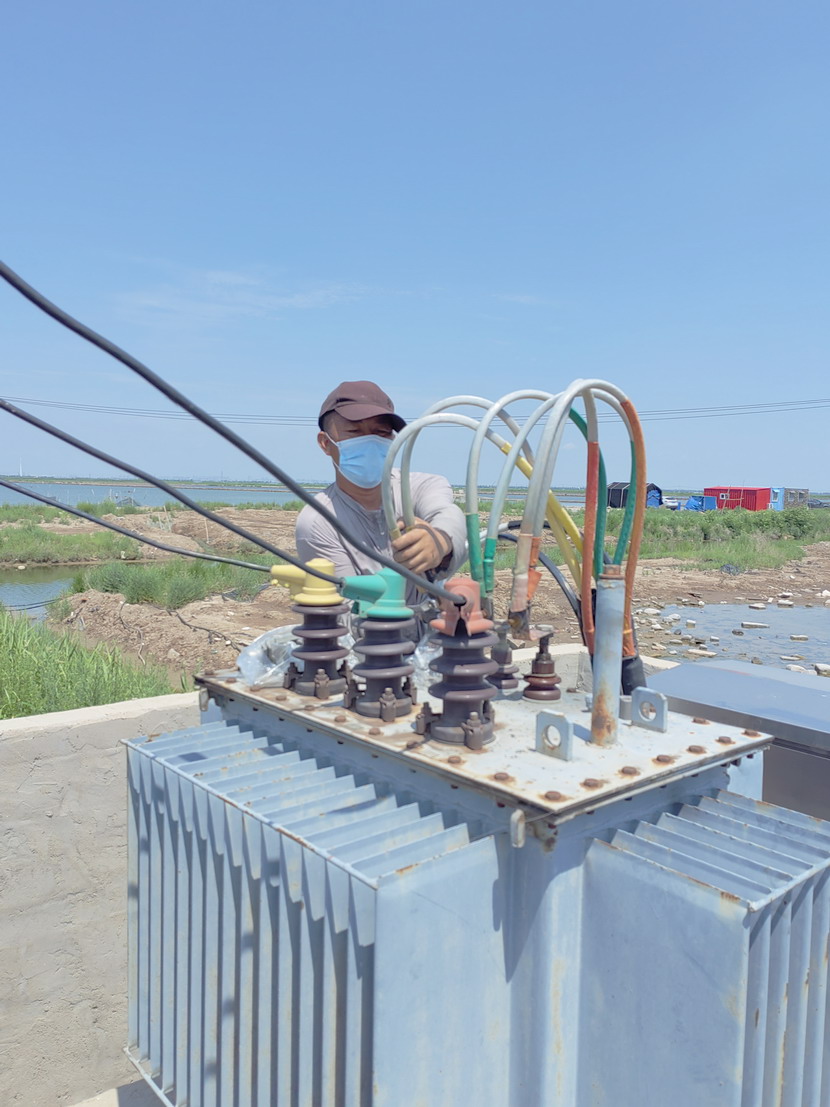 經過現場勘察,發現是用電負符大,導致變壓器上樁頭損壞,從而引起大面積停電,養殖線路搶修就是爭分奪秒與高溫賽跑,高溫下養殖魚塘,只能短時間停電,否則會引起大面積缺氧,導致魚蝦死亡。為用最快的速度完成搶修,保障正常的供電,養殖管理分公司科學分工,合理安排。值班人員電話高知養殖戶停電原因及大約送電時間,要求養殖戶采取措施應付停電;監護人員做好現場監管;電工到塔臺上拆卸樁頭;購材料人員提前到器材店購所需材料。