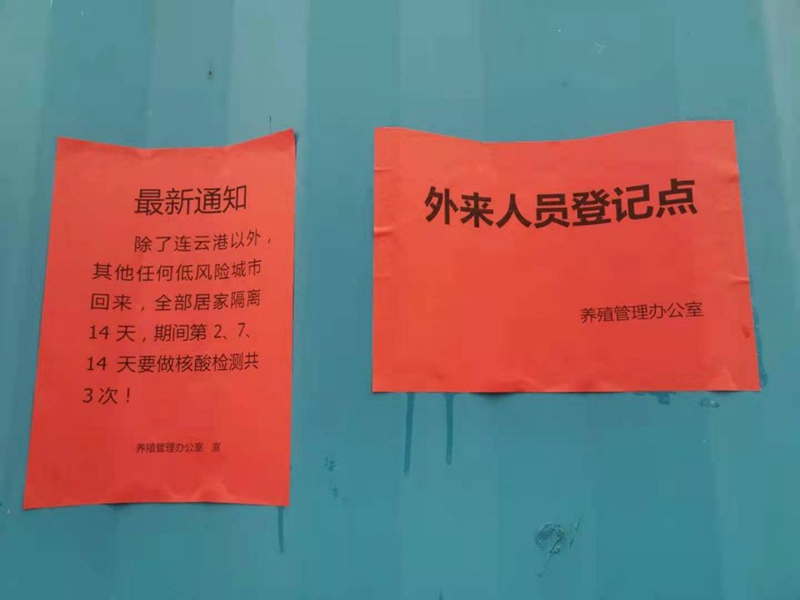 養(yǎng)殖管理辦公室迅速反應(yīng),成立防疫領(lǐng)導(dǎo)小組,加強(qiáng)值班值守,設(shè)置疫情防控設(shè)置隔離點(diǎn)、外來人員登記點(diǎn),張貼疫情動態(tài)通知。養(yǎng)殖辦全員到“塘頭”排查是否有人員與中高風(fēng)險地區(qū)回連人員的接觸史(包括家人和周邊鄰居)和疫苗接種情況;對來往車輛和人員進(jìn)行逐一登記排查,宣傳防疫注意事項;并要求養(yǎng)殖戶不得雇傭除了連云港以外人員干活、不得讓除了連云港以外人員或車輛在池塘進(jìn)出。