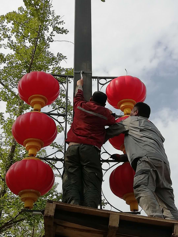 施工現場,大家配合默契利用小型叉車進行輔助拆除作業,五分鐘不用一個燈籠就拆除完成。這邊完成拆除部分,那邊負責還原以及運送回收。由于燈籠的不可收攏性,同時為避免造成二次污染,對于拆下來的燈籠及時進行運送和回收保存,確保第二年要安裝的時候重復利用。