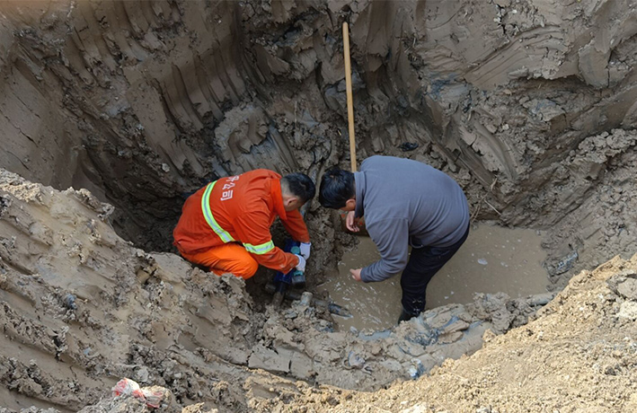 11時,已查明管道漏點處系PE63管道斷裂,至于管道斷裂的原因,判斷是地面沉降使管道落差錯位所致。搶修人員站在2米多深的泥坑里,不怕臟和累,徒手加緊管道搶修。經2個多小時緊張有序搶修,成功將斷裂的水管修好。于當日下午16時30分恢復供水,有力保證了轄區春季綠化澆灌工作正常開展。(王宜全、楊維軍)