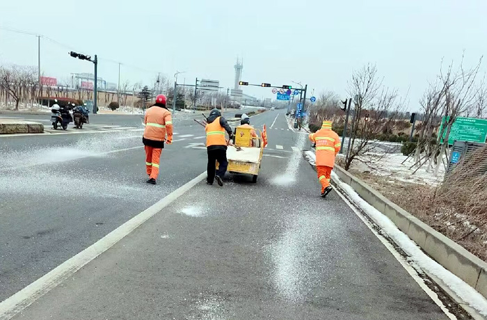 該分公司黨員突擊隊兵分3路,分別來到徐圩大道、港前大道、海濱大道核心路段。生產骨干沈萬軍、李傳武、張樹華等同志他們相互配合,手拿鐵锨簡單有效的進行撒放融雪劑60余噸。發現道路低洼結冰處及車輛轉彎口,他們立即下車利用雪鏟,有來有回的將冰凍鏟除,消除路面一切安全隱患。