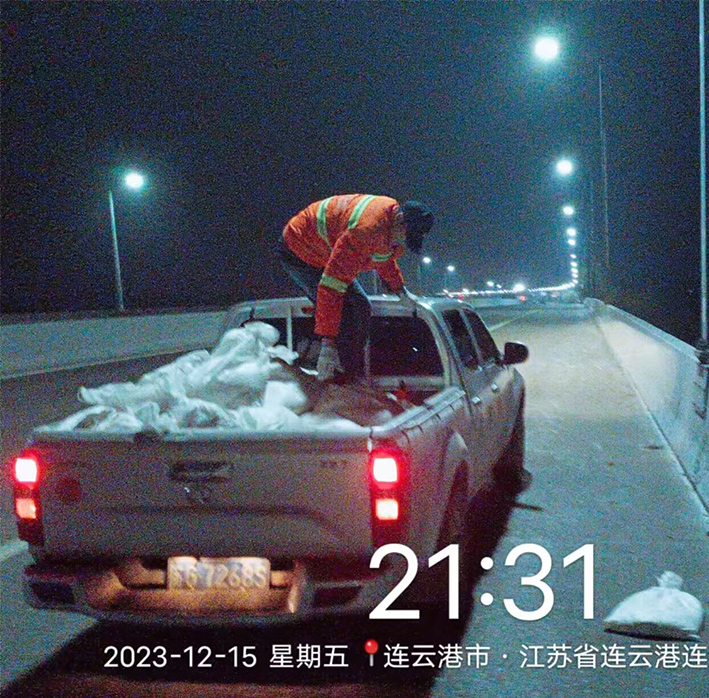 1215日夜間21時左右,受寒潮影響,徐圩大地瞬間飄落鵝毛般雪花。為保障新城主要干道車輛、行人往來石化園區安全暢通經過。保潔分公司結合徐圩城建與悅升公司冬季突發天氣處置預案,聞雪而動,第一時間啟動布放融雪劑工作,大橋兩側盡顯保潔人無懼嚴寒勞動場景。