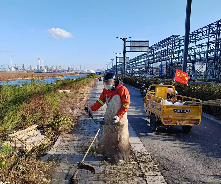 及時配合徐圩城建處理陬山路、石化七消防通道等路段施工產生動態各種垃圾20多車,再次轉運陬山路主道兩側綠化帶中石塊2000多斤。針對園區建設發展情況,序時推進石化五道,四道樣板路工程打造,組織人員突擊清理輔道雜草近1000余米長,撿拾管廊下各種垃圾300余袋。勞動現場,黨員生產骨干薛明柱、朱海勇等同志先鋒示范閃亮道路最前沿,用實際行動保障園區美麗環境。