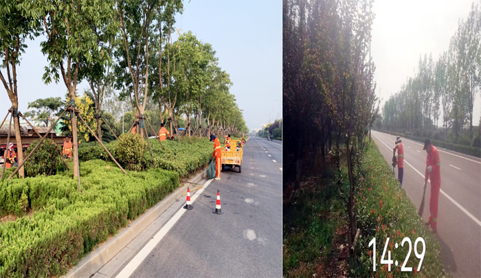 為提高工作效率,該分公司綠化班組在云港路、祥和路核心區(qū)域,采取人機(jī)結(jié)合方式,兵分4路同步推進(jìn)“秋剪”作業(yè)。既:1路,班長(zhǎng)帶領(lǐng)工人負(fù)責(zé)對(duì)道路中間球類修剪造型。植物相對(duì)茂盛,腳下視野遮擋,工人舉著機(jī)器,一步一步往前推進(jìn)作業(yè)。2路,負(fù)責(zé)對(duì)道路兩側(cè)色帶綠籬安排修剪,及時(shí)清理枯樹枝和雜草保持綠化帶干凈整潔。3路,綠化帶內(nèi)高凹不平雜草遮住視野,作業(yè)有點(diǎn)難度,在安全員的帶領(lǐng)下用割灌機(jī)負(fù)責(zé)對(duì)道路兩側(cè)密集的雜草進(jìn)行清理作業(yè)。4路,用掃把和網(wǎng)兜清掃前面一組剪掉的碎葉,保障道路整潔暢通。