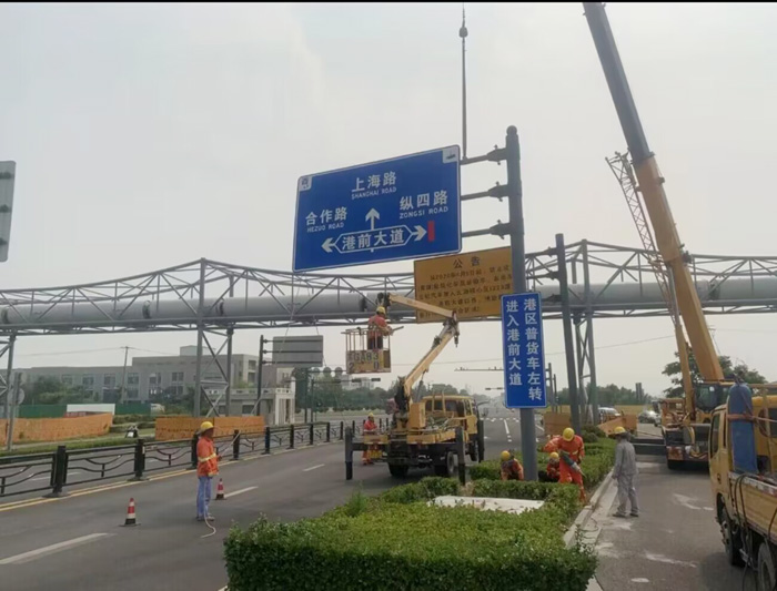 從5月起,市政分公司已著手15座標志牌基座澆筑工作,7月初,完成了基礎養護期,達到安裝條件。因前階段準備工作到位,為此次標志牌安裝作業順利完成奠定了堅實的基礎。本次施工的道路包括港前大道、蘇海路、徐新路等8條道路,共拆除、安裝大型標志牌15套,工程收入約十萬元。